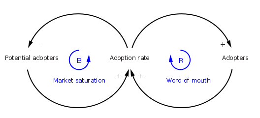 图中的闭循环是CLD的非常重要的特征。闭合循环被定义为加固或者平衡 反馈循环。强化循环是一个循环,其中任何变量的变化的影响通过循环传播,并返回到强化初始偏差的变量,即如果变量在强化循环中增加,整个循环的影响将返回到相同变量的增加,反之亦然。平衡环是这样一个循环,其中任何变量的变化的影响通过该循环传播,并向该变量返回与初始变量相反的偏差,即如果平衡环中的变量增加,整个循环的影响将向相同的变量返回减少,反之亦然。