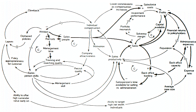 梅多斯解释说,当他和其他人在研究World3 模型时(大约在1970-72年),他们意识到当向他人展示他们的结果时,他们不能使用计算机输出来解释反馈回路在他们的模型中是如何工作的。他们决定使用连接反馈回路中主要模型组件名称的箭头来显示反馈回路(没有库存、流量和每个变量)。这可能是因果循环图的第一次正式使用。[3]