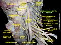 头半棘肌(semispinalis capitis)(complexus)位于颈部的上部和后部,在夹肌之下,位于颈最长肌和头最长肌的内侧。它起始于上方六或七块胸椎和第七块颈椎的横突尖端,以及上面三块颈椎的关节突(C4-C6)上的一系列肌腱。