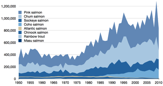 几乎所有捕获的野生鲑鱼都是太平洋鲑。野生大西洋鲑的捕获量一直相对较小,且自1990年以来一直稳步下降。2011年,仅报告了2,500吨。[72] 相比之下,大约一半的养殖鲑鱼是大西洋鲑鱼。