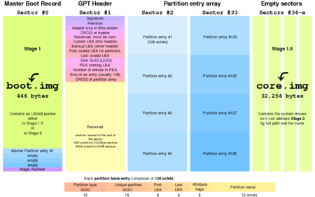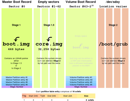计算机开机时,BIOS系统会找到已配置的主引导设备(通常是计算机的硬盘),并从主引导记录(MBR)加载和执行初始引导程序。MBR是硬盘偏移量为零的第一个扇区(扇区计数从零开始)。在很长的一段时间内,一个扇区的大小一直是512字节,但自2009年以来,就出现了被称作高级格式磁盘的扇区大小为4096字节的硬盘。截至2013年10月,通过使用512e仿真,仍可在512字节扇区中访问此类硬盘。[1]