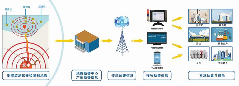 地震发生时,地震仪首先记录到的是P波,但P波振幅较小,要经过一个比较小的时间后(通常几秒到几十秒),S波或面波才会到来,并造成严重破坏。地震预警就是利用地震发生后,P波与S波面波之间的时差。经过粗略计算,距离震源50公里内的地区,会在地震前10秒收到预警信息;90-100公里内的地区,在地震到达前约20多秒收到预警信息。根据数据准确估计震级、震中位置以及快速估计地震对预警目标的影响等。图片引文。[11]