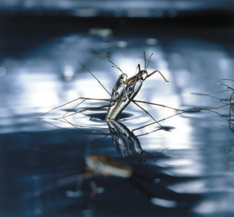 G. gracilicornis除了具有抱握结构外还有特殊的行为机制。雄性利用振动信号吸引捕食者,从而操纵雌性迫使其完成交配。因为雌性会在水面上停止很长一段时间,所以面临更高的来自水中的捕食风险。而由于雄性被雌性所背负,所面临的的风险小于雌性。因此,雄性会轻拍它们的腿,在水中制造涟漪来吸引捕食者。雌性会由于对捕食者的恐惧导致对雄性的抵抗减弱。结果导致交配发生得更快,在此期间雄性则会停止发出信号。