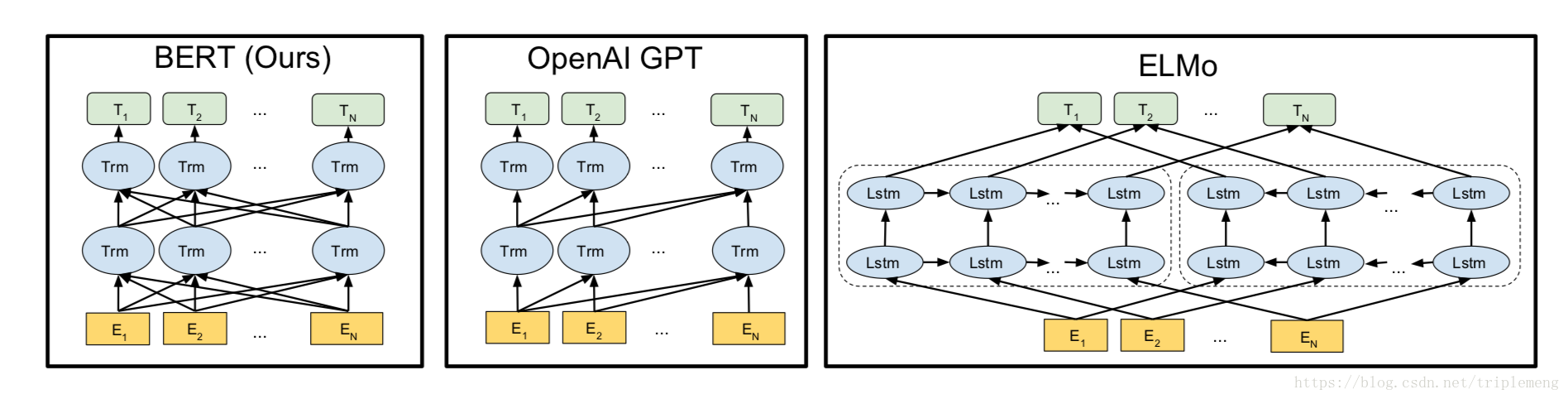 语言模型预训练可以显著提高许多自然语言处理任务的效果,现有的两种方法可以将预训练好的语言模型表示应用到下游任务中:基于特征的方法和微调方法。基于特征的方法比如 ELMo,提取某层或多层特征用于下游任务。而微调方法,如生成预训练 Transformer (OpenAI GPT) 模型,然后引入最小的特定于任务的参数,并通过简单地微调预训练模型的参数对下游任务进行训练。微调方法过去主要的局限性是标准语言模型是单向的,这就限制了可以在预训练期间可以使用的模型结构的选择。通过提出 BERT 改进了基于微调的方法:来自Transformer 的双向编码器表示。BERT、OpenAI GPT 和 ELMo 之间的比较如图所示。