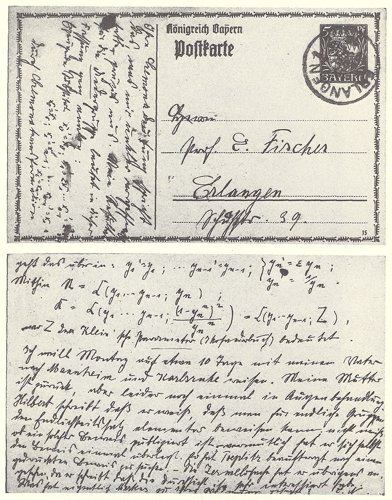 戈尔丹于 1910 年退休,\(^\text{[38]}\) 随后诺特在他的继任者——埃尔哈德·施密特与恩斯特·菲舍尔手下任教,后者于 1911 年接替了前者的职位。\(^\text{[39]}\) 据她的同事赫尔曼·外尔及其传记作者奥古斯特·迪克记载,菲舍尔对诺特产生了重要影响,尤其是他将大卫·希尔伯特的研究成果介绍给了她。\(^\text{[40][41]}\) 诺特与菲舍尔都对数学充满热情,他们常常在讲座结束后仍意犹未尽地讨论问题。据悉,诺特甚至会给菲舍尔寄去明信片,继续推演她的数学思路。\(^\text{[42][43]}\)