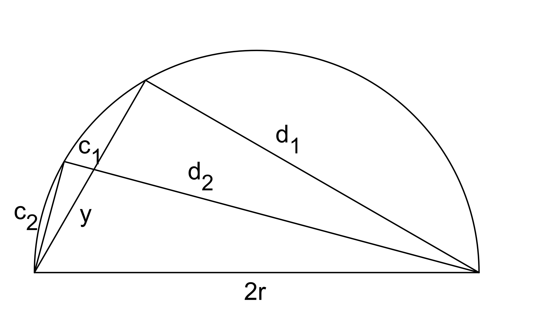 如果这个级数的首项是三角形的面积,那么第二项就是两个三角形面积的和,这两个三角形的底边分别是两条较小的割线,而它们的第三个顶点是抛物线与一条平行于其轴且通过底边中点的直线交点,以此类推。这个证明使用了级数 1/4 + 1/16 + 1/64 + 1/256 + · · ·,它的和为 1/3。