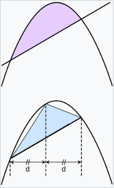图 7:《抛物线的求积》中,证明上图中的抛物线段的面积等于下图中内切三角形面积的 4/3。