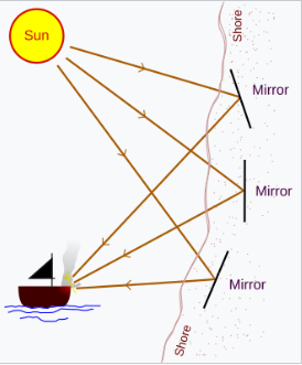 据传说,阿基米德排列镜子形成抛物面反射器,利用聚焦的阳光烧毁进攻叙拉古的船只。虽然没有任何当时的直接证据支持这一壮举,而且现代学者认为这一事件可能并未发生,但阿基米德可能撰写过一部名为《反射光学》(*Catoptrica*)的著作。公元 2 世纪,卢奇安和盖伦曾提到,在叙拉古围城战期间,阿基米德曾用火烧毁敌方船只。近 400 年后,尽管存有疑问,安泰米乌斯尝试重建阿基米德假想的反射器几何结构。