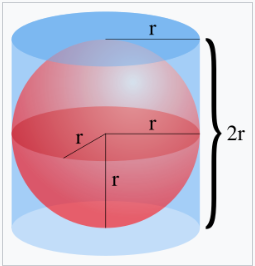 在这部写给多西修斯的两卷本著作中,阿基米德得出了他最自豪的结果,即一个球体与一个外接圆柱之间的关系,二者具有相同的高度和直径。球体的体积为 \( \frac{4}{3} \pi r^3 \),圆柱的体积为 \( 2 \pi r^3 \)。球体的表面积为 \( 4 \pi r^2 \),圆柱的表面积为 \( 6 \pi r^2 \)(包括两个底面),其中 \( r \) 是球体和圆柱的半径。