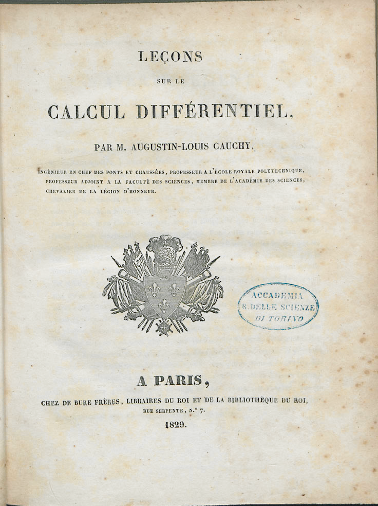 他是第一个严密证明泰勒定理的人,并确立了著名的余项形式。[4] 他为自己在高等师范学校的学生编写了一本教科书[25](见插图),在书中他尽可能严谨地发展了数学分析的基本定理。在这本书中,他给出了极限存在的必要和充分条件,这一形式至今仍在教学中使用。此外,柯西著名的绝对收敛性测试也源自这本书:柯西压缩测试。1829 年,他在另一本教科书中首次定义了复变量的复函数。[26] 尽管如此,柯西自己的研究论文常常使用直观而非严谨的方法;[27] 因此,他的一个定理曾被阿贝尔用 “反例” 揭示,后来通过引入一致连续性的概念得以修正。
