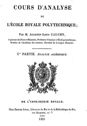 在他的著作《分析课程》中,柯西强调了分析中严格性的 importance。严格性在这里意味着拒绝代数的普遍性原则(早期作者如欧拉和拉格朗日的观点),并通过几何学和无穷小量来替代这一原则。[20] Judith Grabiner 写道,柯西是 “教会整个欧洲严格分析的人”。[21] 这本书经常被认为是首次引入不等式以及 \(\delta - \varepsilon\) 论证到微积分中的地方。在书中,柯西将连续性定义为:如果在给定的区间内,自变量的每一个无限小增量都对应着因变量的一个无限小增量,那么函数 \(f(x)\) 就是连续的。