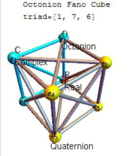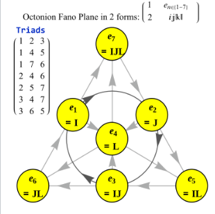 有时会采用一种变体,即将基底元素标记为射影线上 ${\infty, 0, 1, 2, \ldots, 6}$,该射影线是定义在有限域 $\mathrm{GF}(7)$ 上的。此时,乘法规则为 $e_{\infty} = 1, \quad e_{0} e_{1} = e_{3}$,以及所有通过给下标加上常数(模 7)得到的方程。换句话说,利用以下七个三元组:$(0,1,3), \; (1,2,4), \; (2,3,5), \; (3,4,6), \; (4,5,0), \; (5,6,1), \; (6,0,2)$.这些正是**长度为 7 的二次剩余码在 $\mathrm{GF}(2)$ 上的非零码字。在这里存在两个对称性:一个是阶为 7 的对称性,即对所有下标加上模 7 的常数;另一个是阶为 3 的对称性,即将所有下标乘以模 7 的一个二次剩余(1,2,4)。这七个三元组也可以看作是集合 {1,2,4} 的七个平移,它们形成有限域 $\mathrm{GF}(7)$(含七个元素)上的一个循环 (7,3,1) 差集。