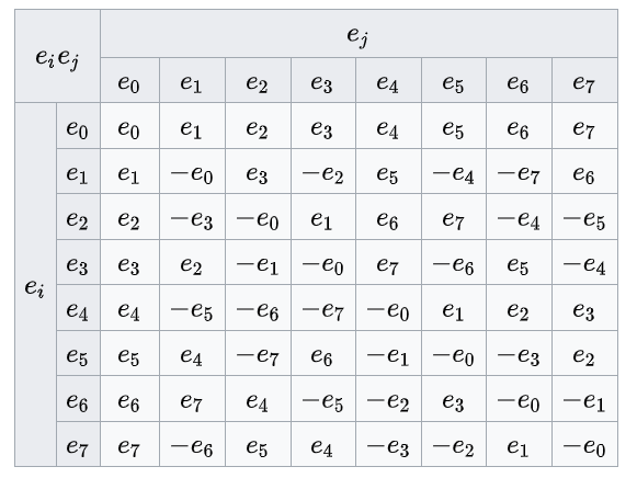 大多数乘法表的**非对角元素**都是**反对称的**,因此它几乎是一个**斜对称矩阵**(skew-symmetric matrix),只是主对角线元素,以及 $e\_{0}$ 所在的行和列例外。