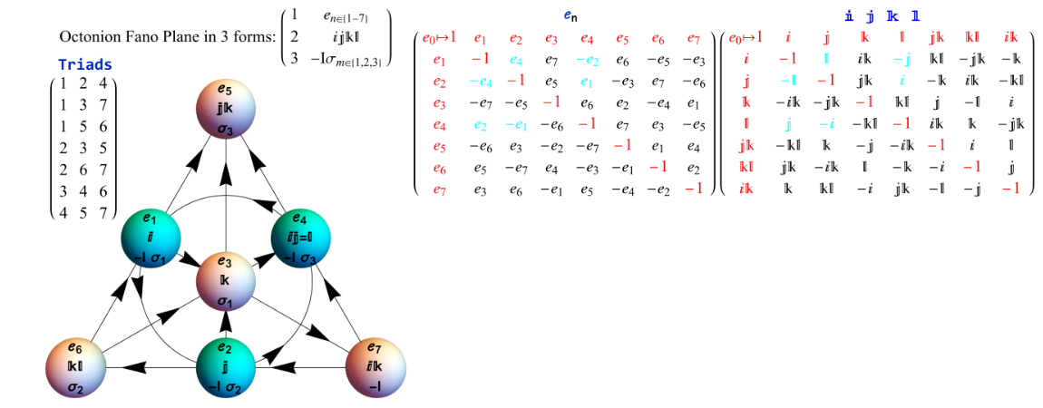 前文所示的法诺平面,配合 $e\_{n}$ 和 IJKL 乘法矩阵,也包含了一个符号为 $(-,-,-,-)$ 的几何代数基。它由以下七个四元数型三元组给出(省略了标量单位元): $$ (I, j, k), \; (i, J, k), \; (i, j, K), \; (I, J, K), \; (\star I, i, l), \; (\star J, j, l), \; (\star K, k, l),~ $$ 或者等价地写作: $$ (\sigma_{1}, j, k), \; (i, \sigma_{2}, k), \; (i, j, \sigma_{3}), \; (\sigma_{1}, \sigma_{2}, \sigma_{3}), \; (\star \sigma_{1}, i, l), \; (\star \sigma_{2}, j, l), \; (\star \sigma_{3}, k, l).~ $$ 其中:小写符号 ${i, j, k, l}$ 表示向量,例如 ${\gamma_{0}, \gamma_{1}, \gamma_{2}, \gamma_{3}}$ 大写符号 ${I, J, K} = {\sigma_{1}, \sigma_{2}, \sigma_{3}}$ 表示双向量,例如 $\gamma_{{1,2,3}} \gamma_{0},$ 算子 $\star = i j k l$ 是伪标量元。