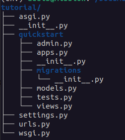 cd tutorial; django-admin startapp quickstart; cd ..。会生成如图 1 的 quickstart 目录。