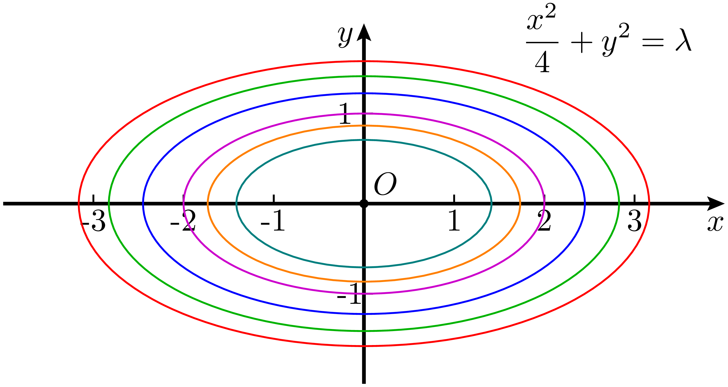 例如,设 $p = 2,q = 1$,则表达式为 $\displaystyle\frac{x^2}{4} + y^2 = \lambda$。如果取 $\lambda = 0.5, 0.75, 1, 1.5, 2, 2.5$,就可以画出从内到外一系列大小不同但形状相似的椭圆,如 图 4 所示。