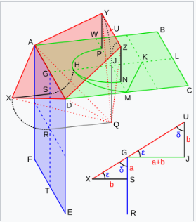 最后三卷(第 11 至 13 卷)主要讨论立体几何。[39] 第 11 卷通过引入 37 个定义,为接下来的两卷提供了背景。[56] 尽管它的基础性质类似于第 1 卷,但与后者不同,它没有公理系统或公设。[56] 第 11 卷的三个部分包括关于立体几何的内容(1–19),立体角(20–23)和平行六面体(24–37)。[56]