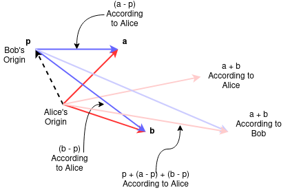 例如:如果 Alice 走到了: $$ \lambda a + (1 - \lambda)b~ $$ 那么 Bob 会走到: $$ p + \lambda(a - p) + (1 - \lambda)(b - p) = \lambda a + (1 - \lambda)b~ $$ 只要满足:$\lambda + (1 - \lambda) = 1$ 无论他们各自认为哪个点是原点,都会用相同的线性组合描述同一个点。