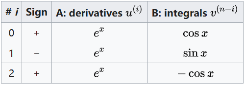 在这种情况下,$A$ 列与 $B$ 列在 $i=2$ 时的乘积(配合相应符号)会得到原始被积函数的相反数(比较 $i=0$ 行与 $i=2$ 行)。 $$ \underbrace{\int e^{x}\cos x\,dx}_{\text{step 0}} = \underbrace{(+1)(e^{x})(\sin x)}_{j=0} + \underbrace{(-1)(e^{x})(-\cos x)}_{j=1} + \underbrace{\int(+1)(e^{x})(-\cos x)\,dx}_{i=2}.~ $$ 注意到右边的积分可以包含自己的积分常数 $C'$,把这个抽象的积分移到等式另一边,就得到: $$ 2\int e^{x}\cos x\,dx = e^{x}\sin x + e^{x}\cos x + C',~ $$ 最终: $$ \int e^{x}\cos x\,dx = \tfrac{1}{2}\bigl(e^{x}(\sin x + \cos x)\bigr) + C,~ $$ 其中 $C = \tfrac{C'}{2}$.