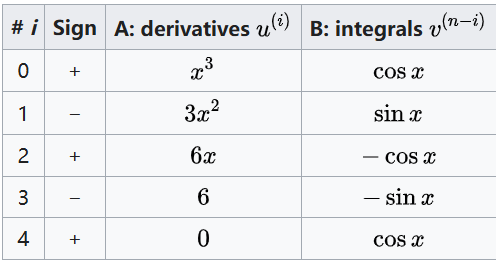 例如,考虑积分: $$ \int x^{3}\cos x \, dx~ $$ 并取 $u^{(0)} = x^{3}, \quad v^{(n)} = \cos x$.