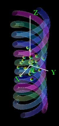 凝聚体在宏观上可观测的动量为: $$ \langle \Psi | \hat{P} | \Psi \rangle = N_{\text{at}} \hbar (k_+ - k_-),~ $$ 其中 $N_{\text{at}}$ 是凝聚体中的原子数。这意味着原子集体沿 $z$ 轴以群速度相干移动,其方向由拓扑荷数 $\ell$ 和角速度 $\Omega$ 的符号共同决定:\(^\text{[22]}\) $$ V_z = \frac{2 \Omega \ell}{k_+ + k_-}.~ $$ 而被螺旋势俘获的凝聚体的角动量严格为零:\(^\text{[21]}\) $$ \langle \Psi | \hat{L} | \Psi \rangle = N_{\text{at}} [\ell \hbar - \ell \hbar] = 0.~ $$ 对螺旋势中冷原子体系的数值模拟表明,单个原子的轨迹会被限制在螺旋势阱内部。\(^\text{[23]}\)