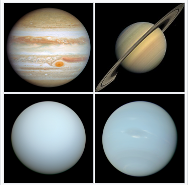 图 1:太阳系的四颗巨行星如下:(上)木星与土星(气体巨行星)(下)天王星与海王星(冰巨行星)它们按照与太阳的距离顺序排列,并以真实色彩呈现。尺寸不按比例绘制。