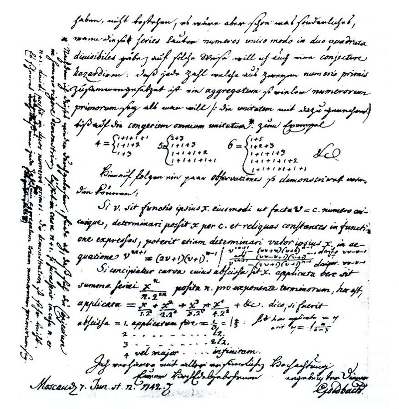 哥德巴赫与欧拉的通信包含了哥德巴赫对数学,特别是数论领域的一些最重要贡献。\(^\text{[2]}\) 哥德巴赫与欧拉的友谊延续了哥德巴赫于 1728 年移居莫斯科之后,二人继续保持通信。\(^\text{[3]}\) 他们的通信跨越了 35 年,共 196 封信,信件用拉丁语、德语和法语书写。\(^\text{[6]}\) 这些信件涵盖了广泛的主题,包括各种数学话题。\(^\text{[2]}\) 哥德巴赫是欧拉在数论方面兴趣和工作的主要影响者。\(^\text{[3]}\) 大多数信件讨论了欧拉在数论和微分学方面的研究。[3] 直到 1750 年代末,欧拉关于数论研究的通信几乎完全是与哥德巴赫的通信。\(^\text{[3]}\)