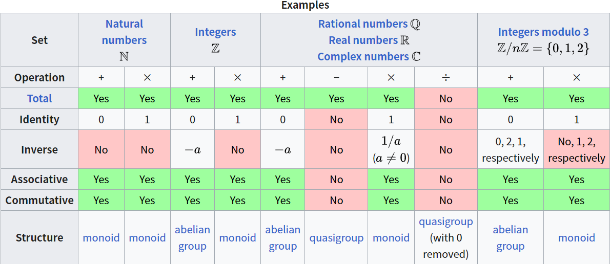 一个常见的群是整数集 \[ \mathbb{Z} = \{\ldots, -4, -3, -2, -1, 0, 1, 2, 3, 4, \ldots\}~ \] 配备加法运算 \((+)\)。对于任意两个整数 \(a\) 和 \(b\),它们的和 \(a + b\) 仍然是整数;这个封闭性表明加法是整数集 \(\mathbb{Z}\) 上的一个二元运算。