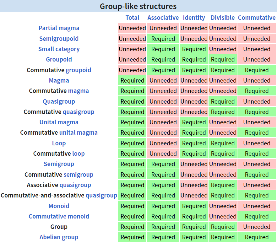更一般的结构可以通过放宽定义群的某些公理来定义。[31][86][87] 下表列出了一些推广群的代数结构。例如,如果去掉 “每个元素都有逆元” 这一要求,则得到的代数结构称为幺半群(monoid)。自然数集合 \(\mathbb{N}\)(包含零)在加法下构成一个幺半群,非零整数集合 \((\mathbb{Z} \smallsetminus \{0\}, \cdot)\) 在乘法下也是一个幺半群。