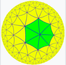 对称群是由给定数学对象的对称性构成的群,主要是几何实体,例如上面作为介绍示例给出的正方形的对称群,尽管它们也出现在代数学中,比如在伽罗瓦理论中处理的多项式方程根之间的对称性(见下文)。[51] 从概念上讲,群论可以看作是对称性的研究。[p] 数学中的对称性极大地简化了几何或分析对象的研究。如果每个群元素可以与对 \(X\) 的某个操作相关联,并且这些操作的组合遵循群法则,则称群作用于另一个数学对象 \(X\)。例如,(2,3,7)三角群的一个元素通过排列三角形作用于双曲平面的三角形镶嵌。[50] 通过群作用,群的模式与被作用对象的结构相联系。