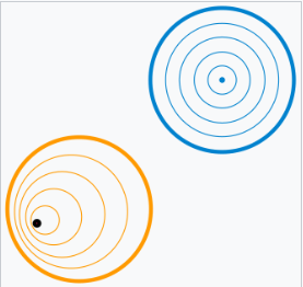 拓扑空间的基本群的元素是闭环的等价类,其中闭环被认为是等价的,如果一个闭环可以平滑地变形为另一个闭环,群运算是 “连接”(先描绘一个闭环,再描绘另一个)。例如,如图所示,如果拓扑空间是去掉一个点的平面,那么不绕过缺失点的闭环(蓝色)可以平滑地收缩为一个单一的点,并且是基本群的单位元。一个绕缺失点转圈 \( k \) 次的闭环不能变形为绕转 \( m \) 次的闭环(其中 \( m \neq k \)),因为该闭环无法平滑地穿过空洞,因此每个闭环类由其绕缺失点的旋转次数来表征。由此得到的群同构于整数加法群。