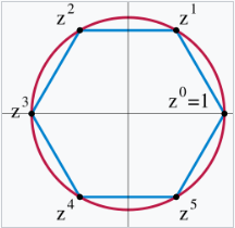 一个循环群是一个所有元素都是某个特定元素 \(a\) 的幂的群。[46] 在乘法表示法中,群的元素是 \[\dots, a^{-3}, a^{-2}, a^{-1}, a^{0}, a, a^2, a^3, \dots,~\] 其中 \(a^2\) 表示 \(a \cdot a\),\(a^{-3}\) 表示 \(a^{-1} \cdot a^{-1} \cdot a^{-1} = (a \cdot a \cdot a)^{-1}\),等等。[o] 这样的元素 \(a\) 被称为群的生成元或原始元素。在加法表示法中,元素要成为原始元素的要求是群的每个元素都可以写成 \[\dots, (-a) + (-a), -a, 0, a, a + a, \dots,~\] 在上面介绍的群 \((\mathbb{Z}/n\mathbb{Z}, +)\) 中,元素 1 是原始元素,因此这些群是循环群。实际上,每个元素都可以表示为所有项都是 1 的和。任何具有 \(n\) 个元素的循环群都与这个群同构。循环群的第二个例子是 \(n\) 阶复数单位根群,给定满足 \(z^n = 1\) 的复数 \(z\)。这些数字可以被视为正 \(n\) 边形的顶点,如图中蓝色部分所示(对于 \(n = 6\))。群运算是复数的乘法。在图中,与 \(z\) 相乘对应的是逆时针旋转 60°。[47] 从域论的角度看,群 \(\mathbb{F}_p^\times\) 是循环群,其中 \(p\) 为素数;例如,当 \(p = 5\) 时,3 是生成元,因为 \(3^1 = 3\),\(3^2 = 9 \equiv 4\),\(3^3 \equiv 2\),且 \(3^4 \equiv 1\)。