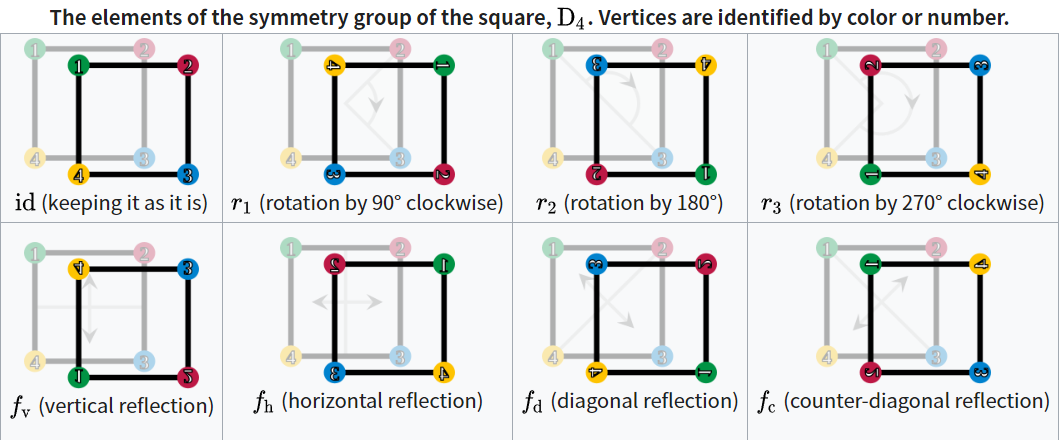 这些对称变换本质上是函数,它们将正方形上的一个点映射到对称变换后的对应点。例如:\( r_1 \):将一个点顺时针旋转 90°,围绕正方形的中心。\( f_h \):将一个点关于水平中轴线反射。组合两个这样的对称变换,仍然得到另一个对称变换。因此,这些对称变换构成了一个群,称为四阶二面体群,记作 \( D_4 \)。该群的底层集合就是上述八个对称变换,而群运算是函数复合。两个对称变换的组合是按照函数复合的方式进行的,即:先应用第一个变换 \( a \),再应用第二个变换 \( b \)。记作:\(b \circ a\) 这表示先执行对称变换 \( a \),然后对结果再应用对称变换 \( b \)。这里采用的记号是从右到左的顺序,这是函数复合的标准记法。