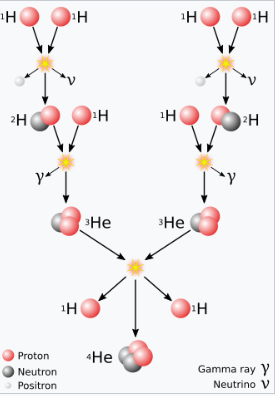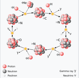 1938 年 3 月 17 日,贝特参加了卡内基学会和乔治·华盛顿大学举办的第四届年度华盛顿理论物理学会议。会议仅邀请了 34 名与会者,但包括了格雷戈里·布雷特、苏布拉马尼扬·钱德拉塞卡、乔治·伽莫夫、唐纳德·门泽尔、约翰·冯·诺伊曼、本特·斯特罗姆格伦、爱德华·泰勒和梅尔·图夫等人。贝特最初拒绝了邀请,因为会议的主题——恒星能量生成——对他不感兴趣,但泰勒说服他参加。会议上,斯特罗姆格伦详细介绍了已知的太阳温度、密度和化学成分,并挑战物理学家们提出解释。伽莫夫和卡尔·弗里德里希·冯·魏茨泽克在 1937 年的一篇论文中提出,太阳的能量是质子-质子链反应的结果:[66][67] \[ p + p \rightarrow \ ^2_1D + e^+ + \nu_e ~\] 但这并未解释比氦更重的元素的观测结果。会议结束时,贝特与查尔斯·克里奇菲尔德合作,提出了一系列后续的核反应,解释了太阳如何发光:[68] \[ ^2_1D + p \rightarrow ^3_2He + \gamma~\] \[ ^3_2He + ^4_2He \rightarrow ^7_4Be + \gamma~\] \[ ^7_4Be + e^- \rightarrow ^7_3Li + \nu_e~\] \[ ^7_3Li + p \rightarrow 2 \ ^4_2He~\] 这并没有解释较重恒星中的过程,这一点并没有被忽视。当时,人们对质子-质子循环是否描述了太阳内部的过程持怀疑态度,但最近对太阳核心温度和亮度的测量显示,质子-质子循环确实解释了太阳的能量来源。[66] 当贝特回到康奈尔大学后,他研究了相关的核反应和反应截面,最终发现了碳-氮-氧循环(CNO 循环):[69][70] \[ ^{12}_6C + p \rightarrow ^{13}_7N + \gamma~\] \[ ^{13}_7N \rightarrow ^{13}_6C + e^+ + \nu_e~\] \[ ^{13}_6C + p \rightarrow ^{14}_7N + \gamma~\] \[ ^{14}_7N + p \rightarrow ^{15}_8O + \gamma~\] \[ ^{15}_8O \rightarrow ^{15}_7N + e^+ + \nu_e~\] \[ ^{15}_7N + p \rightarrow ^{12}_6C + ^4_2He~\] 贝特与克里奇菲尔德合著的关于质子-质子循环的论文以及关于碳-氮-氧(CNO)循环的另一篇论文,已被提交至《物理评论》期刊以供发表。[71]