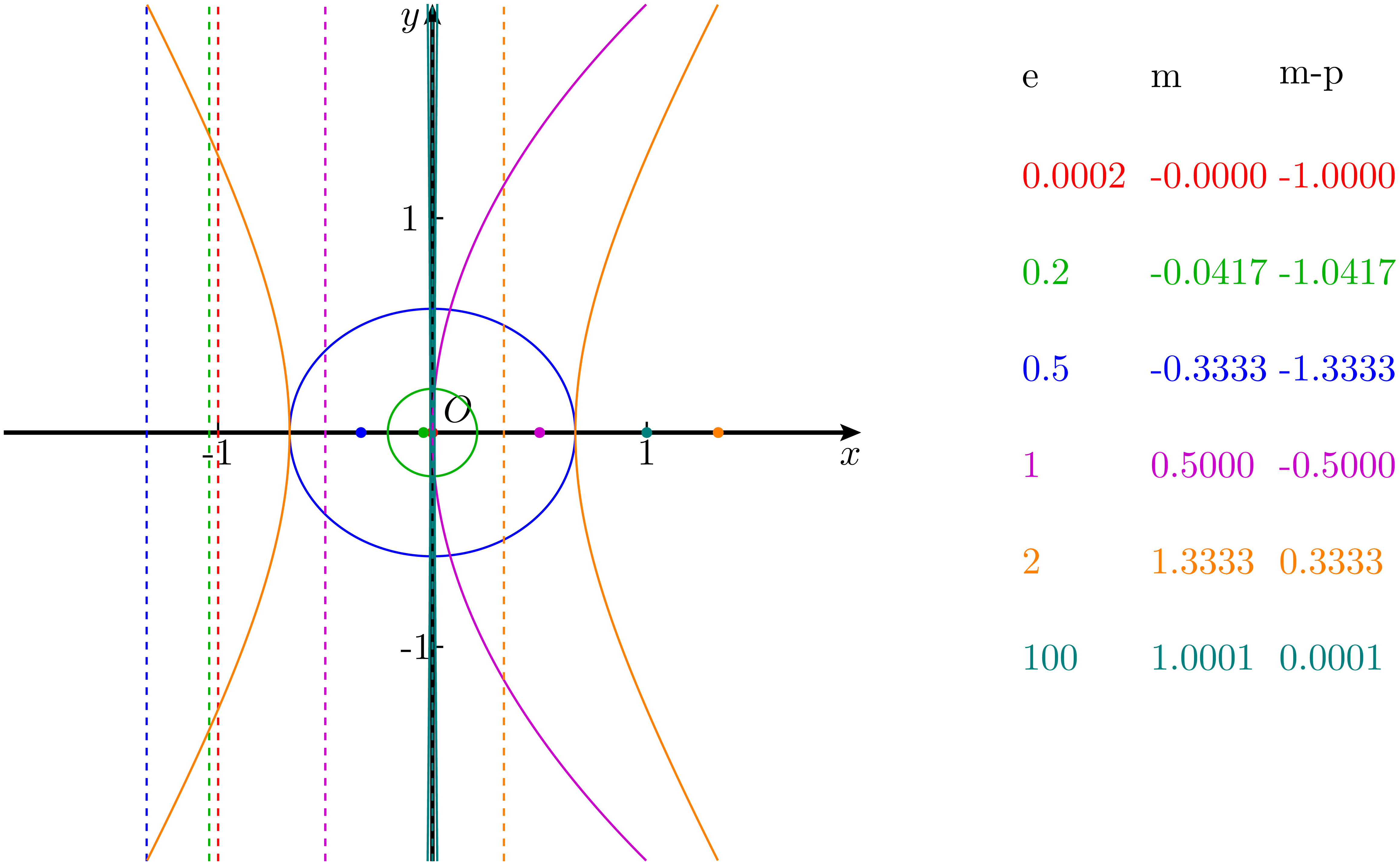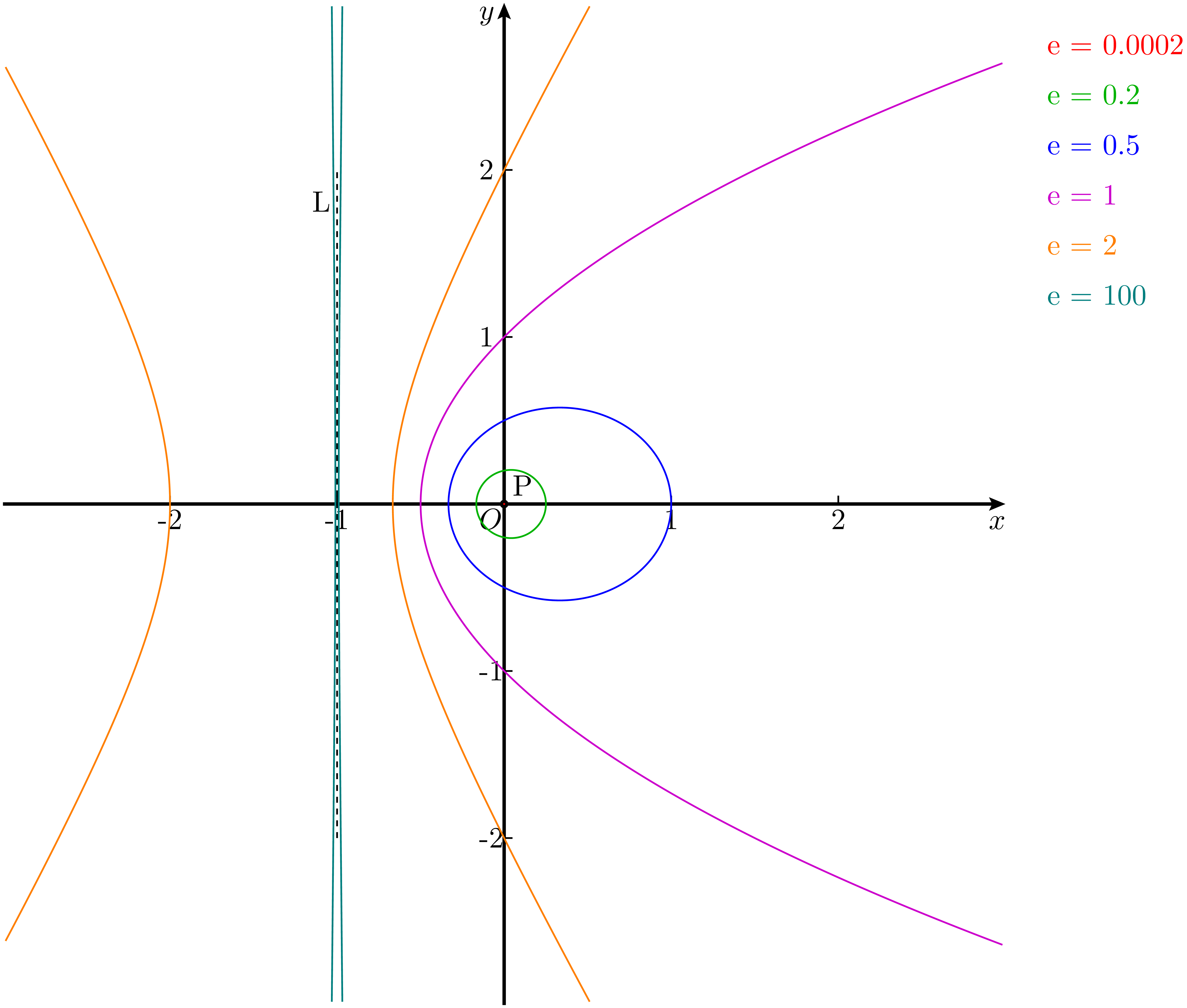 由此可以看出,在 “焦点–准线” 定义的推导过程中,完全未涉及 “另一个焦点”。这一点恰好呼应了前文关于行星轨道的讨论:只需给定一个点和约束条件——焦点到准线的距离 $p$ 和距离比值 $e$,就能唯一确定一条圆锥曲线。其中,当 $e < 1$ 时对应椭圆,$e > 1$ 对应双曲线,而 $e = 1$ 则是抛物线。值得注意的是,所有的圆锥曲线的图像都与焦点位于准线的同一侧。