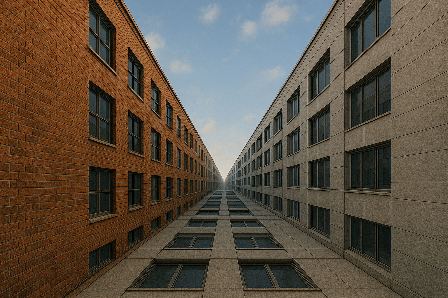 可是真实世界中一些肉眼可见的现象,却似乎在挑战这种 “常识”。比如,在铁轨之间远眺时,两条原本平行的铁轨,看起来竟然在远方逐渐靠近,最后仿佛汇聚到一个点上;又比如仰头站在高楼下,两面垂直上升的墙体,也好像在天际会合于某个点。