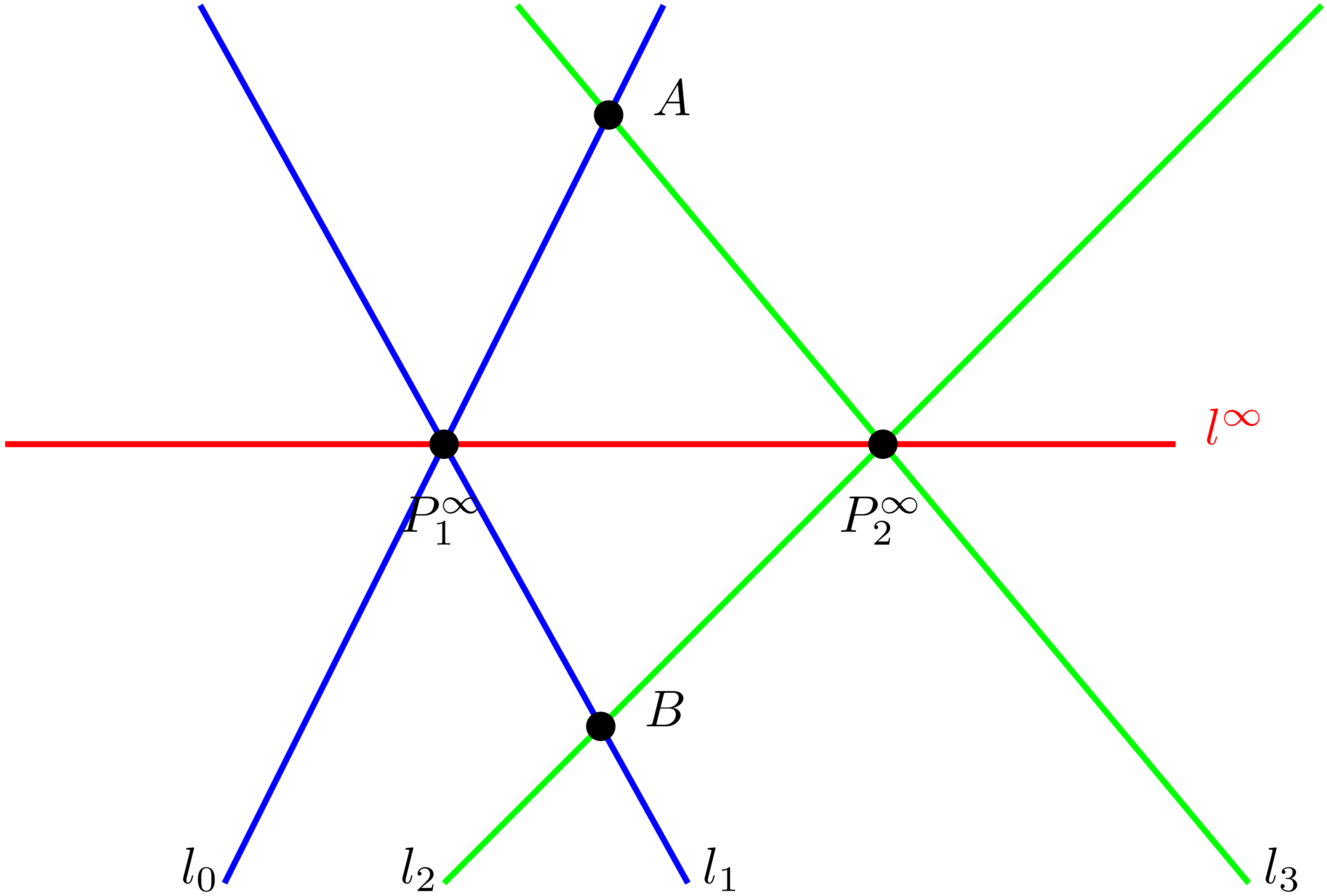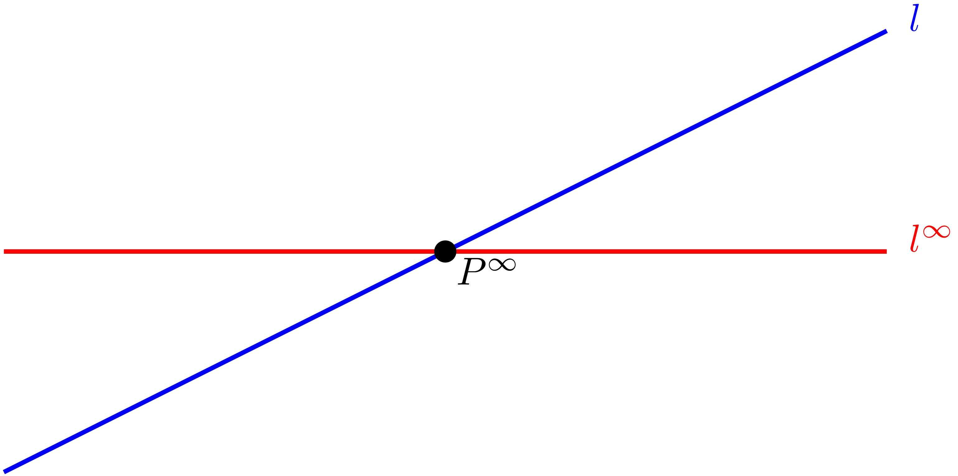 当然,光是加入一些 “远方的点” 并不会带来本质上的不同。关键是:这个体系如何组织这些点与其他元素之间的关系。射影几何的一个核心设定是:所有方向相同的直线,在无穷远处相交于同一个点。也就是说,朝着相同方向延伸的所有平行线,共用一个无穷远点。而因为方向可以连续变化,不同方向就对应着一整条连续的无穷远点,这条 “由所有无穷远点组成的直线” 就被称为无穷远直线(line at infinity),通常记作 $l^\infty$。如图 4 所示,任意两条直线都存在一个交点1,当交点在无穷远直线上时,称这两条直线平行。