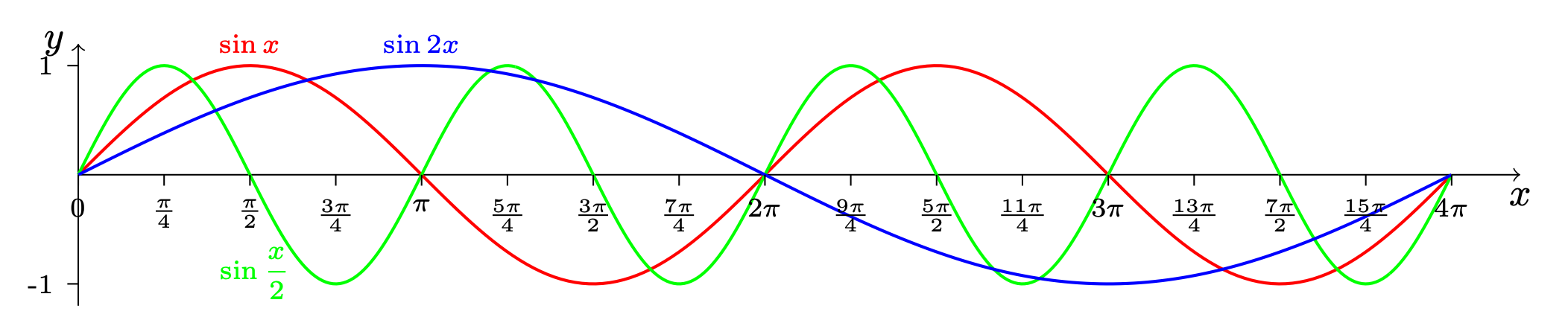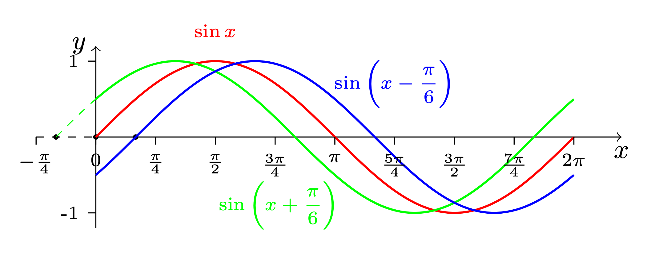 这一结果表明,$\sin x$ 和 $\cos x$ 的高阶导数呈现周期性变化。对于 $\sin x$,每求一次导数,相位都会提前 $\displaystyle\frac{\pi}{2}$7。由于 $\sin x$ 的周期为 $2\pi$,两次求导导致反相,而四次求导则保持同相,回归原函数。
