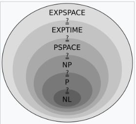 同样,\( co\text{-}NP \) 是包含 \( NP \) 问题的补集问题(即答案是 “是” 或 “否” 相反)的一类。人们普遍认为 \( NP \) 不等于 \( co\text{-}NP \),但这一点尚未得到证明。显然,如果这两个复杂度类不相等,则 \( P \) 不等于 \( NP \),因为 \( P = co\text{-}P \)。因此,如果 \( P = NP \),则我们将有: \[ co\text{-}P = co\text{-}NP \quad \Rightarrow \quad NP = P = co\text{-}P = co\text{-}NP~ \] 同样,目前尚不清楚 \( L \)(可以在对数空间内解决的所有问题的集合)是否严格包含于 \( P \),还是与 \( P \) 相等。同样,\( P \) 和 \( L \) 之间存在许多复杂度类,如 \( NL \) 和 \( NC \),目前尚不清楚它们是不同的类还是相等的类。
