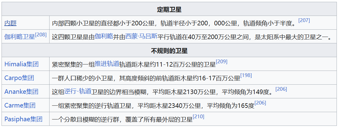 至少有 97 颗卫星绕木星运行;其中四颗最大的卫星——木卫一(Io)、木卫二(Europa)、木卫三(Ganymede)和木卫四(Callisto)——位于其磁层内,用普通双筒望远镜即可观测。四者中最大的木卫三比行星水星还要大。木星周围还存在一个暗淡的行星环系统。木星环主要由尘埃组成,分为三部分:内侧呈光环状尘粒环的 “晕环”(halo)、相对明亮的主环(main ring),以及外侧的薄雾状 “薄环”(gossamer ring)。这些行星环在可见光和近红外光下呈现红色。木星环系统的年龄尚不清楚,可能追溯至木星形成时期。自 1973 年以来,已有九个机器人探测器访问过木星:包括七次飞掠任务和两艘专门的轨道探测器(另有两艘在途中)。在其他行星系统中也已发现类似木星的系外行星。