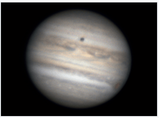 由于木星的轨道位于地球轨道之外,从地球观测到的木星相位角始终小于 11.5°;因此,通过地基望远镜看到的木星总是几乎完全被照亮的。只有在飞掠木星的航天器任务中,才获得了呈弦月状的木星影像 \(^\text{[139]}\)。在小型望远镜下通常可以看到木星的四颗伽利略卫星,以及横跨木星大气的云带。口径约 4–6 英寸(10–15 厘米)的较大望远镜在大红斑朝向地球时能够观测到该结构 \(^\text{[140][141]}\)。