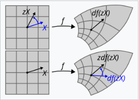 (注意,如果 \( f \) 在 \( z_0 \) 处是复微分的,那么它也是实微分的,并且 \( f \) 在 \( z_0 \) 处的雅可比矩阵是复数标量 \( f'(z_0) \),可以看作是 \( \mathbb{C} \) 上的实线性映射,因为极限 \(|f(z) - f(z_0) - f'(z_0)(z - z_0)|/|z - z_0| \to 0\) 和 \(z \to z_0\) 成立。)
