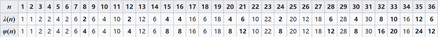 下表比较了 $\lambda(n)$(OEIS 数列 A002322)与 $\varphi(n)$ 的前 36 个值(当二者不同的时候,$\varphi(n)$ 用粗体表示;使它们不同的那些 $n$ 的值列在 OEIS 数列 A033949 中)。