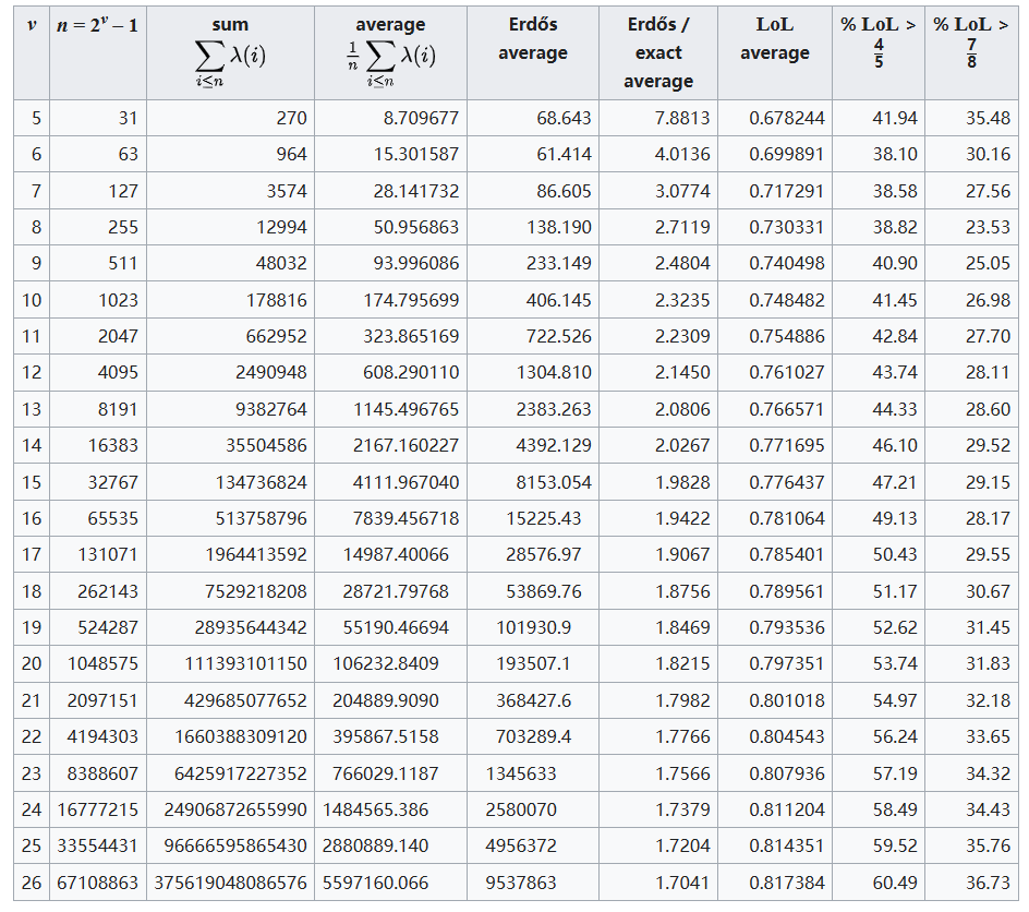 下表给出了 $\lambda$ 函数前 $2^{26} - 1 = 67\,108\,863$ 个值的概览,包括其精确平均值和埃尔德什近似值。