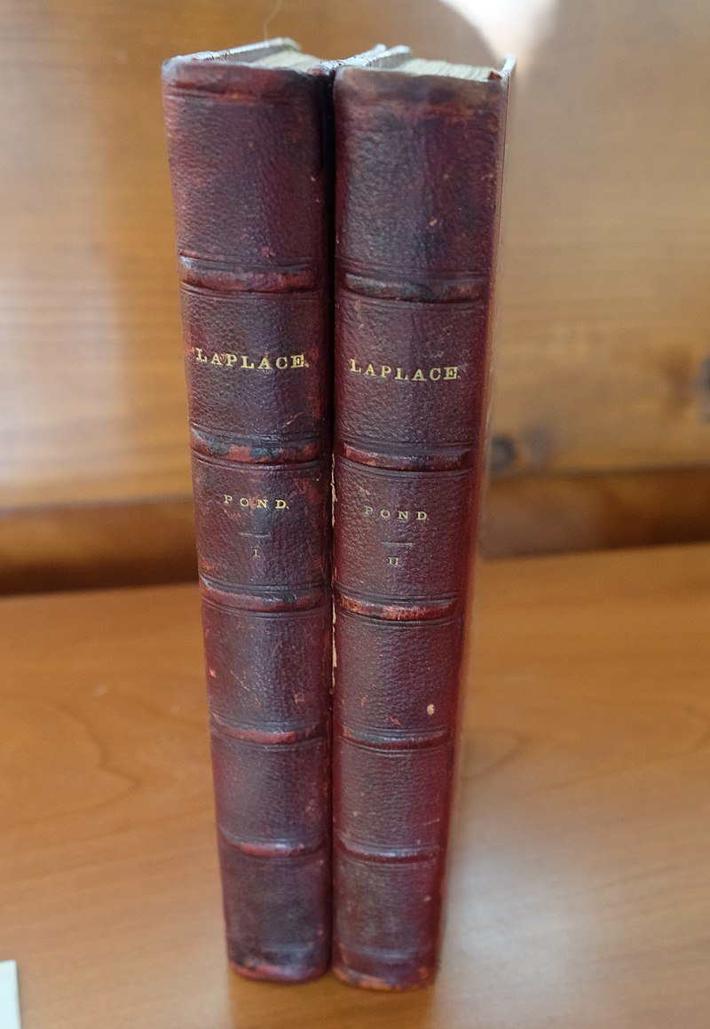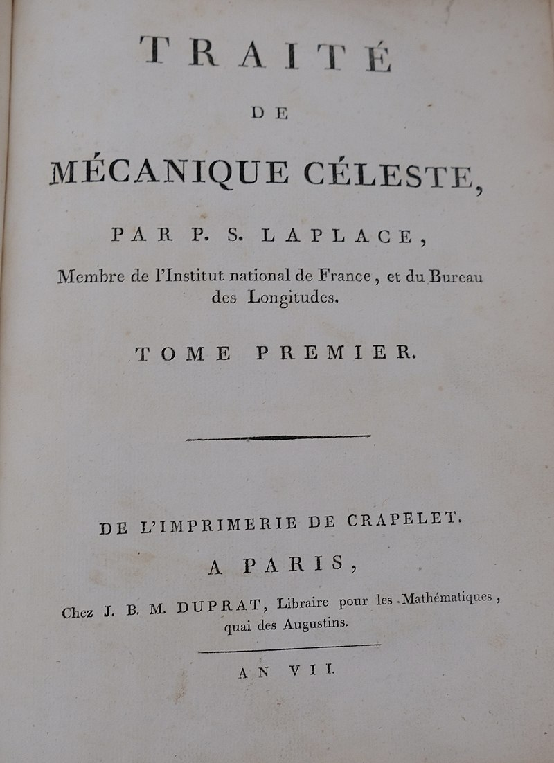 拉普拉斯对太阳系的分析性讨论载于他的《天体力学》(Mécanique céleste),该书分为五卷。前两卷于 1799 年出版,内容包括行星运动的计算方法、行星形状的确定以及潮汐问题的求解方法。[6] 第三卷和第四卷分别于 1802 年和 1805 年出版,包含了这些方法的应用以及若干天文表。第五卷于 1825 年出版,主要是历史性的,但作为附录给出了拉普拉斯最新研究的成果。《天体力学》包含了拉普拉斯的许多个人研究,但其中许多结果是借用其他作家的成果,且几乎没有提及来源。该书的结论,被历史学家描述为其他作家和拉普拉斯一百年努力的组织性成果,拉普拉斯却将其呈现为仅属于他自己的发现。[13]