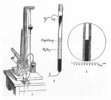 李普曼的电计由一根 1 米长、直径 7 毫米的普通玻璃管组成,管两端开放,并通过坚固的支架保持竖直位置。下端被拉成一个毛细点,直到毛细管的直径为 0.005 毫米。管内充满了水银,毛细点浸入稀硫酸中(体积比为 1:6 的水),并且在含酸的容器底部有少量水银。每根管内的水银都与一根铂金线连接,最后还设置了使毛细点能通过显微镜(放大 250 倍)观察到的装置。这样的一种仪器非常敏感;李普曼指出,它能够测量出极小的电势差,甚至可以达到 1/10,080 Daniell 电池的电势差。因此,它是一种非常精密的观察和(通过补偿法可进行标定)测量微小电动势的工具。[10][11]