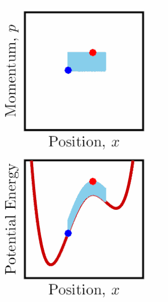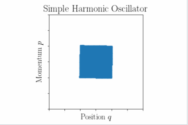 剩下的问题是相空间体积如何随时间演化。上面我们已经展示了总体积是守恒的,但没有说明它的具体形态。对于单个粒子,我们可以看到其在相空间中的轨迹是一个常量 \( H \) 的椭圆。通过显式解哈密顿方程,我们可以得到: \[ \begin{aligned} q_i(t) &= Q_i \cos\left(\omega t\right) + \frac{P_i}{m\omega} \sin\left(\omega t\right) , \\ p_i(t) &= P_i \cos\left(\omega t\right) - m\omega Q_i \sin\left(\omega t\right) , \end{aligned}~ \] 其中 \( Q_i \) 和 \( P_i \) 分别表示第 \(i\) 个粒子的初始位置和动量。对于多粒子系统,每个粒子都有一个相空间轨迹,描绘出与粒子能量对应的椭圆。椭圆的旋转频率由哈密顿量中的 \( \omega \) 给出,与能量的差异无关。因此,相空间的某个区域将围绕点 \( (\mathbf{q}, \mathbf{p}) = (0, 0) \) 旋转,旋转频率依赖于 \( \omega \)。