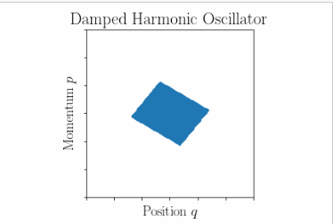 为了明确看到李奥维尔定理的违反,我们可以按照与无阻尼谐振子类似的程序进行,并再次得到: \[ dq_i' dp_i' = dq_i dp_i \left[ 1 + \left( \frac{\partial^2 H}{\partial q_i \partial p_i} - \frac{\partial^2 H}{\partial p_i \partial q_i} - \gamma \right) \delta t \right],~ \] \[ = dq_i dp_i \left[ 1 - \gamma \delta t \right].~ \] 计算我们的新微小相空间体积,并仅保留 \( \delta t \) 的一阶项,我们得到如下结果: \[ \mathrm{d} \Gamma' = \prod_{i=1}^{N} d^3q_i' d^3p_i' = \left[ 1 - \gamma \delta t \right]^{3N} \prod_{i=1}^{N} d^3q_i d^3p_i = \mathrm{d} \Gamma \left[ 1 - 3N \gamma \delta t \right].~ \] 我们发现微小的相空间体积不再是常数,因此相空间密度不再守恒。可以从方程中看到,随着时间的推移,我们预计相空间体积会随着摩擦力的作用而减少至零。