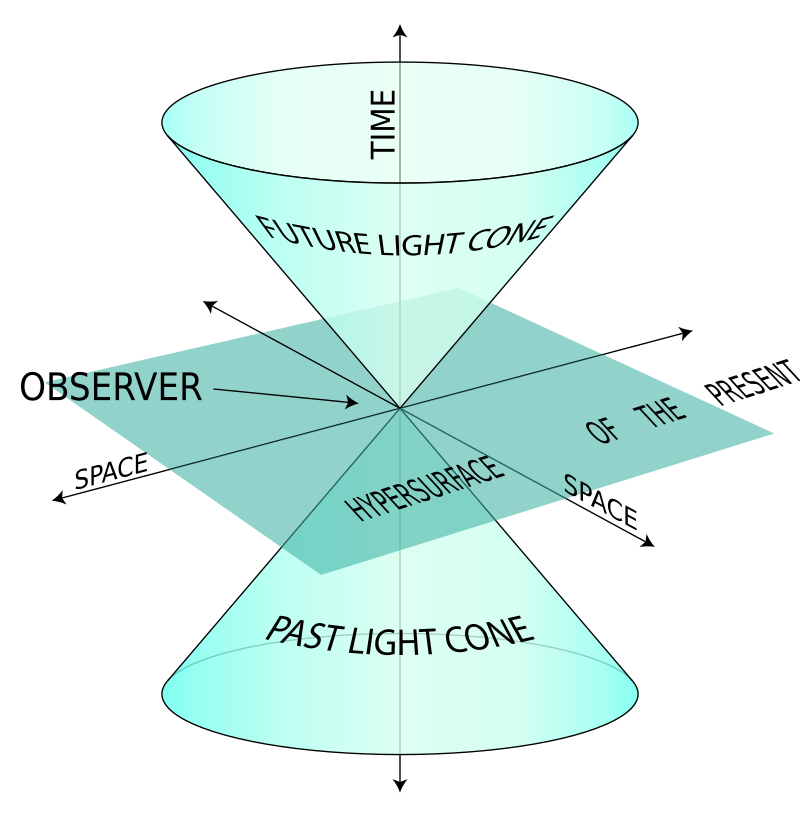 根据洛伦兹群的定义,它保持如下二次型: \[ Q(x) = x_{0}^{2} - x_{1}^{2} - x_{2}^{2} - x_{3}^{2}.~ \] 在平直时空 $\mathbf{R}^{1,3}$ 上,正时洛伦兹群 $O^{+}(1,3)$ 的传递性曲面 $Q(x)=\text{const.}$ 如下所示:\(^\text{[3]}\)