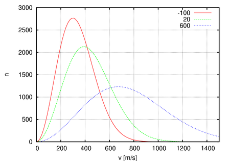 麦克斯韦–玻尔兹曼分布是麦克斯韦–玻尔兹曼统计在气体粒子动能上的具体应用。理想气体中粒子速度(或速率)的分布可以从统计假设推导得出,该假设认为气体分子的能级由其动能给出: \[ f(v) = \left( \frac{m}{2 \pi k_B T} \right)^{3/2} 4 \pi v^2 e^{-\frac{m v^2}{2 k_B T}}~ \] 其中: